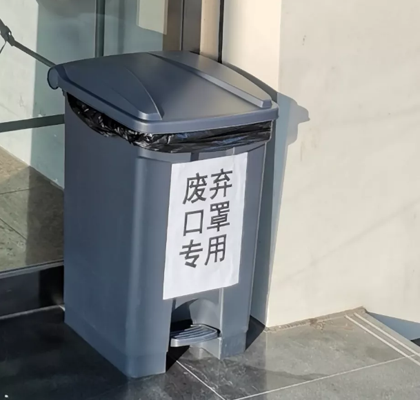 公司院内设置了专门垃圾桶存放废弃口罩,工作人员每天两次使用84消毒剂对垃圾桶进行消毒处理。