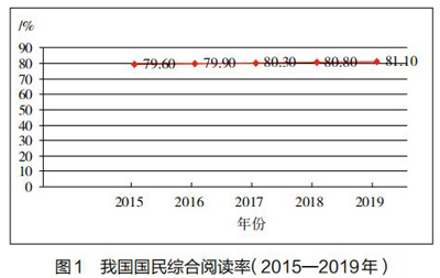 如图1所示,2015—2019年我国国民综合阅读率呈逐年缓慢上升趋势,2019年我国国民综合阅读率和2015年我国国民综合阅读率相比增长了1.50%,这说明我国国民综合阅读能力在不断增强,全民阅读活动得到全国人民群众的广泛参与,全民阅读正从个体行为逐步转向全民的文化自觉。