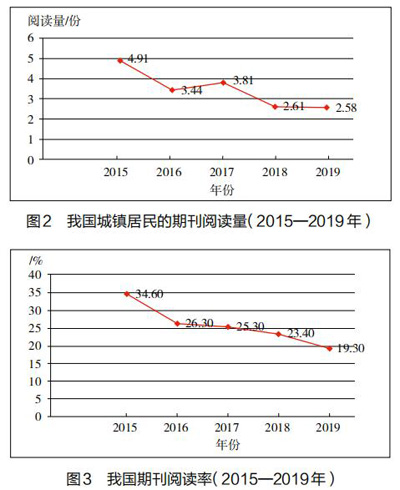 如图2所示,2017年城镇居民的期刊阅读量为3.81期(份)和2016年城镇居民的期刊阅读量3.44期(份)相比增长了0.37期(份),2017年后期刊阅读率逐年下滑。如图3所示,2019年和2015年相比较跌幅达15.3%,阅读率呈逐年下滑趋势。这说明我国期刊阅读发展受到了较大冲击。
