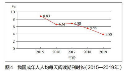 如图4所示,2015年我国成年人人均每天阅读期刊时长呈下降态势,2017年阅读期刊时长为6.88分钟略有回升,2019年我国成年人人均每天阅读期刊时长比2015年阅读期刊时长下降了4.95分钟。