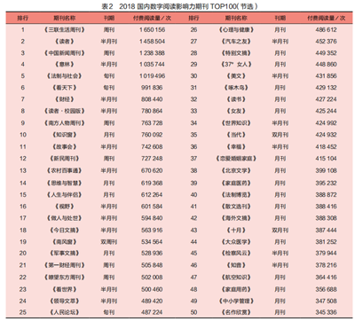 另据龙源数字传媒集团和中国新闻出版研究院联合发布的“2018数字阅读影响力期刊TOP100”,可以了解到期刊在全民阅读中的分布状况和发展趋势。如表2所示,“2018国内数字阅读影响力期刊TOP100”总阅读量从2017年的2007万篇次,增加至4286万篇次。文化综合类、党政学习类、教育类、文学文艺类、时政新闻类等5类期刊受到网络用户的青睐。
