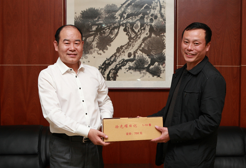 公司常务副总经理、藏书报总编辑韩冰雪代表公司向徐洪刚同志赠送《徐光耀日记》