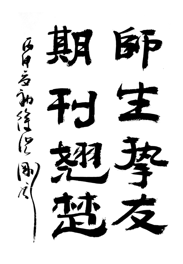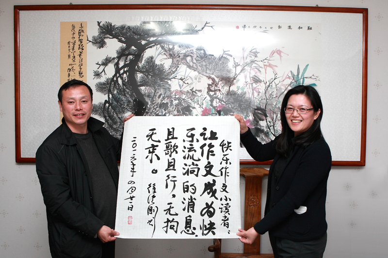 徐洪刚上世纪九十年代的英雄事迹曾影响了整整一代人,时任党和国家领导人江泽民、李瑞环、胡锦涛以及军委副主席刘华清、张震等先后接见和题词嘉勉徐洪刚。但徐洪刚从不以英雄自居,在荣誉面前始终保持清醒头脑,谦虚谨慎,奋发有为,不仅在本职工作上做出了新的突出贡献,而且在文学艺术方面颇有建树。他目前是中国作家协会会员,同时也是一位十分活跃的书法家。潘海波向徐洪刚介绍了阅读传媒公司的情况,当他听闻我公司旗下《快乐作文》在全国拥有50余万小读者时,表示非常钦佩,欣然为杂志写下“师生挚友,期刊翘楚”的勉励,并寄语小读者“让作文成为快乐流淌的消息,且歌且行,无拘无束”。会谈结束后,徐洪刚应邀兴致勃勃地来到阅读传媒公司文化空间“悦心堂”,挥毫泼墨,抒发豪情。儒雅的言谈举止、深厚的书法功力、扎实的文化底蕴,充分展现出了英雄的另一面。